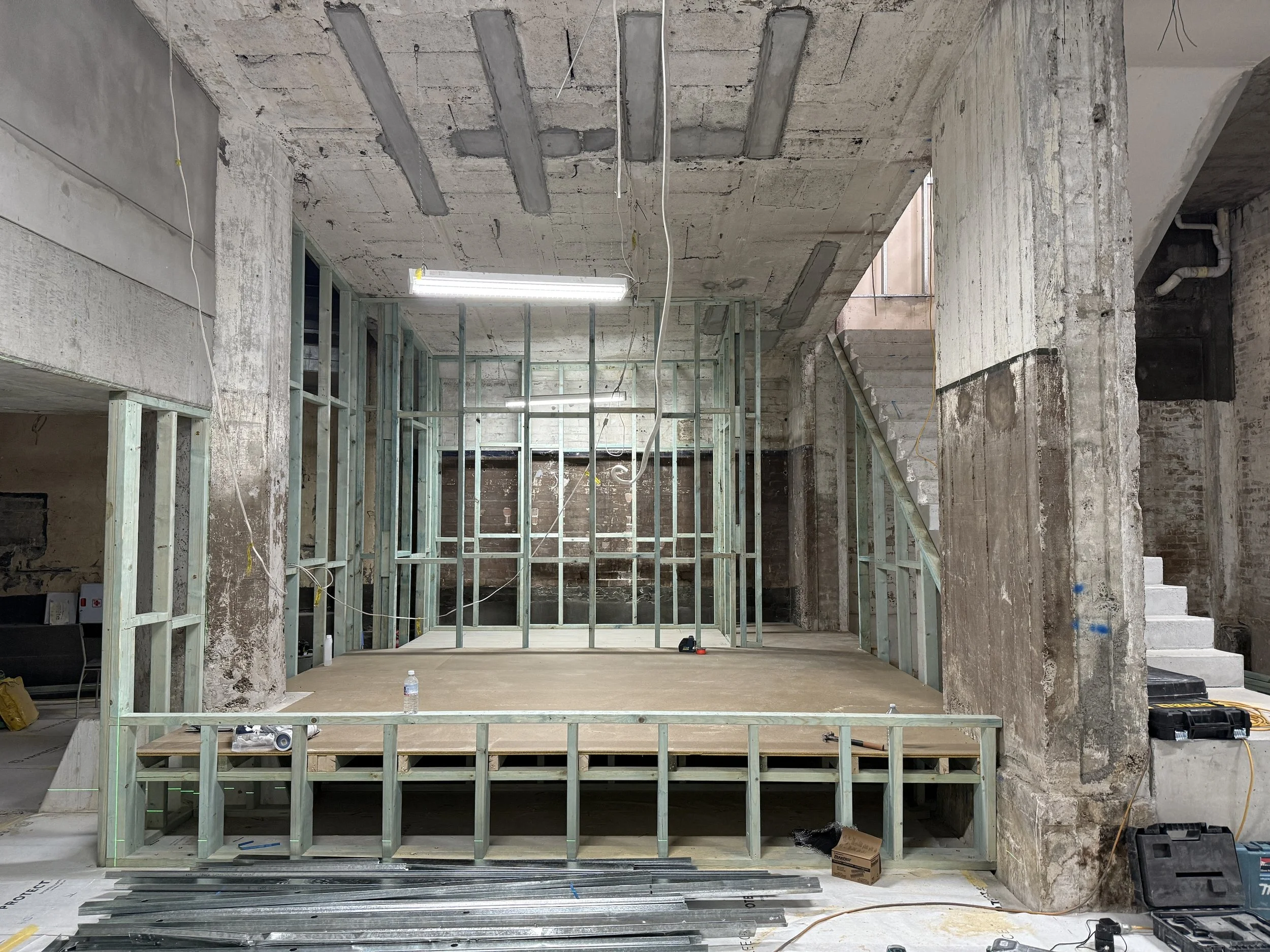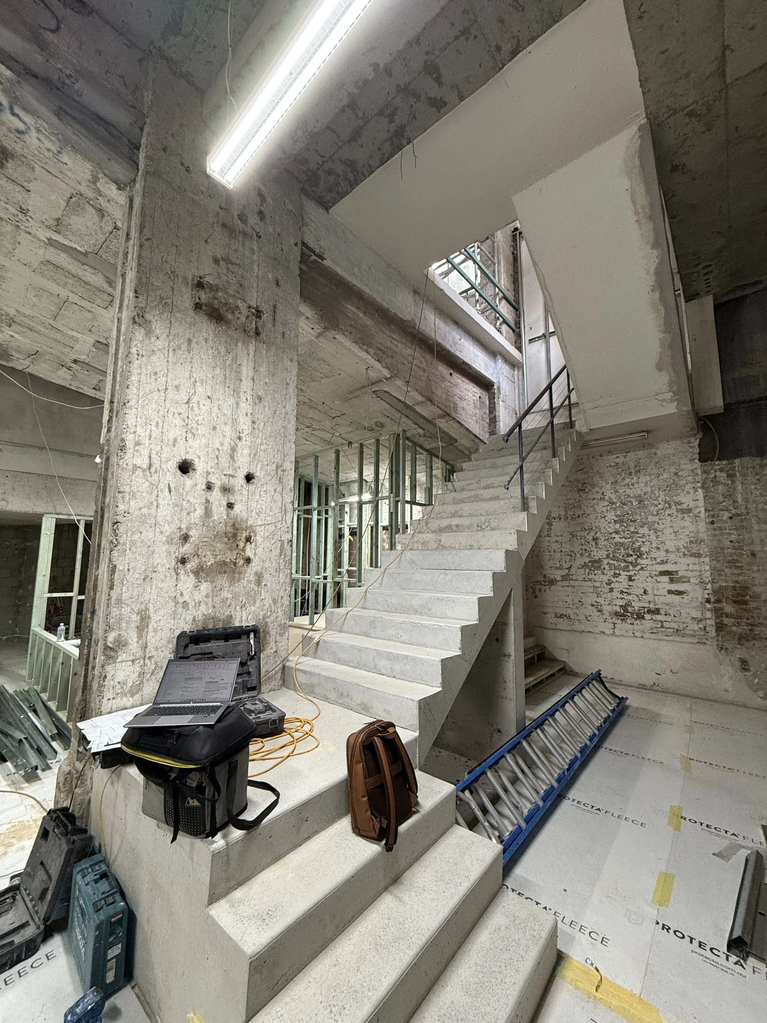 Early works involved a careful strip-out of existing fitout and redundant services, while retaining and protecting shared infrastructure servicing other parts of the building. The concrete shell was prepared for new works through patching, sealing, and structural adjustments setting a clean foundation for the insertions to follow