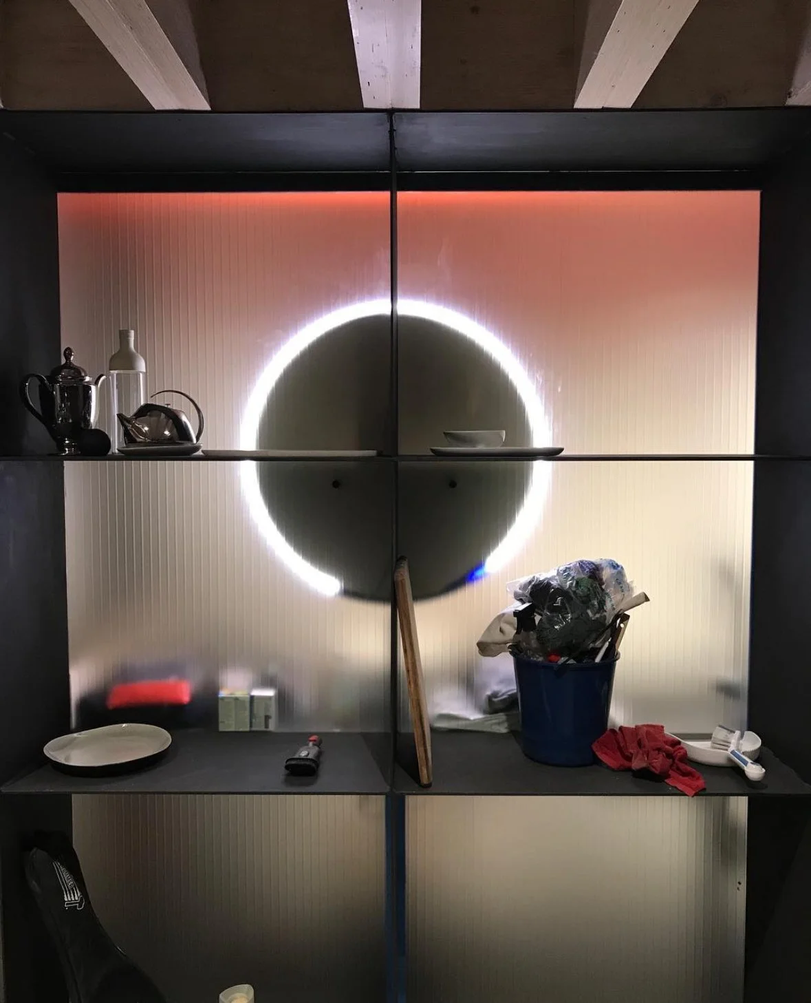 Huge structural steel elements the cantilvered upper floor getting them through the front door and apartment building was difficult, steel blades form both shelves and support for the glass bridge