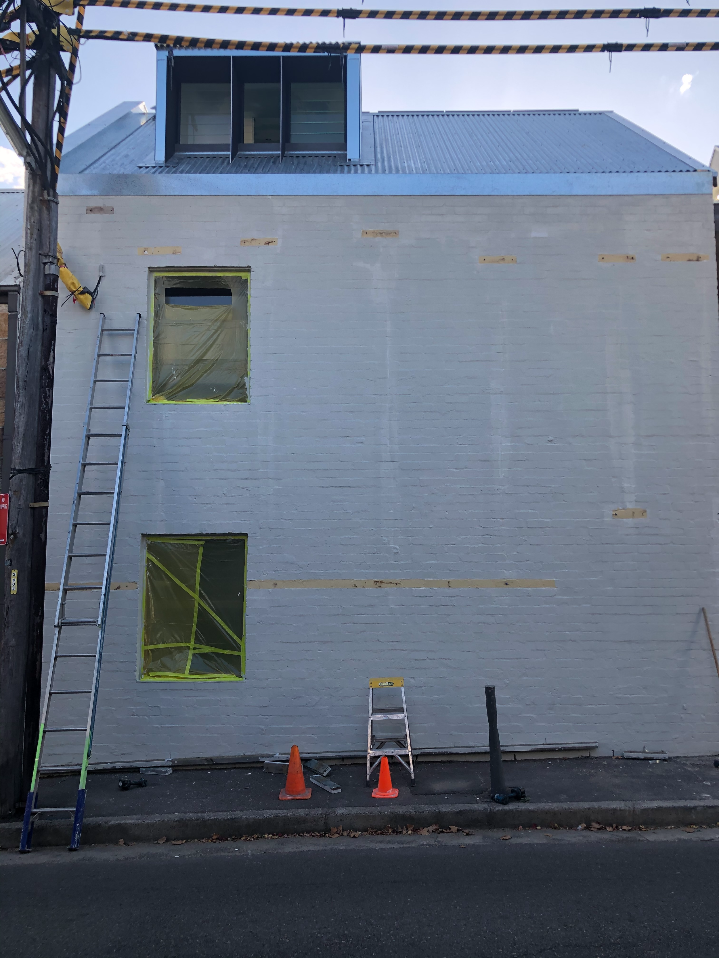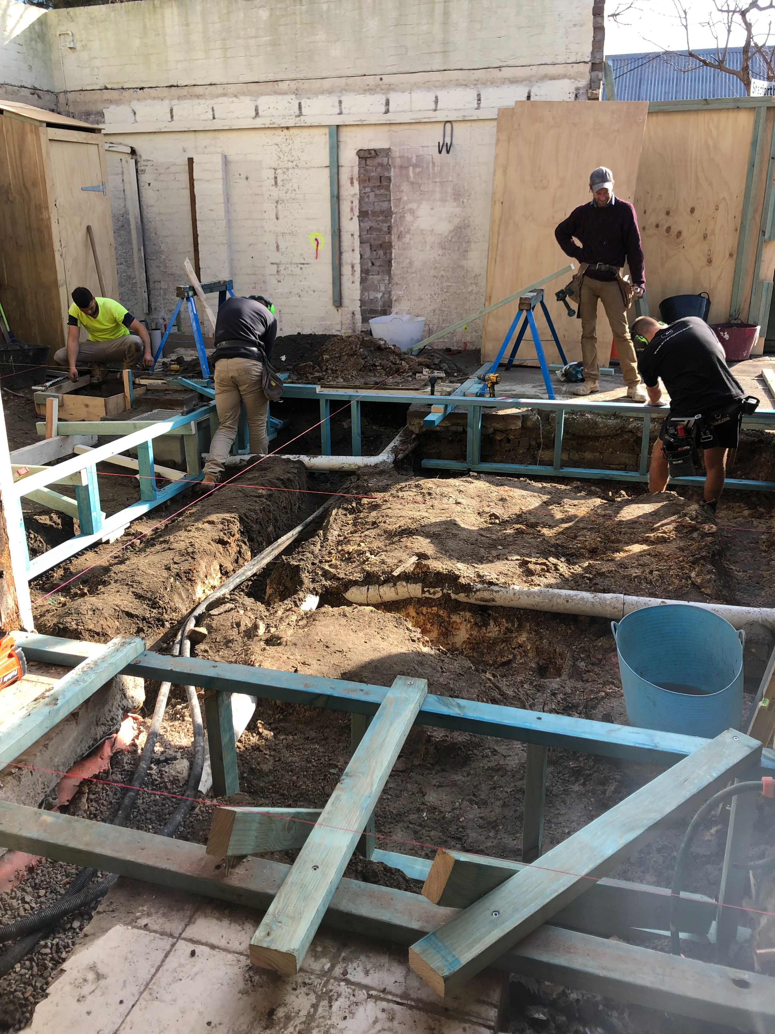 Early works required surgical precision. With no off-street parking and limited access on a one-way street, demolition was staged and coordinated to maintain site safety and retain the existing perimeter walls. Structural bracing supported elements to be kept, while hazardous materials were safely removed and salvageable bricks, timber, and fittings were stored for reuse. The new concrete slab was poured between the original walls, anchoring the future works with minimal tolerance and maximum control.