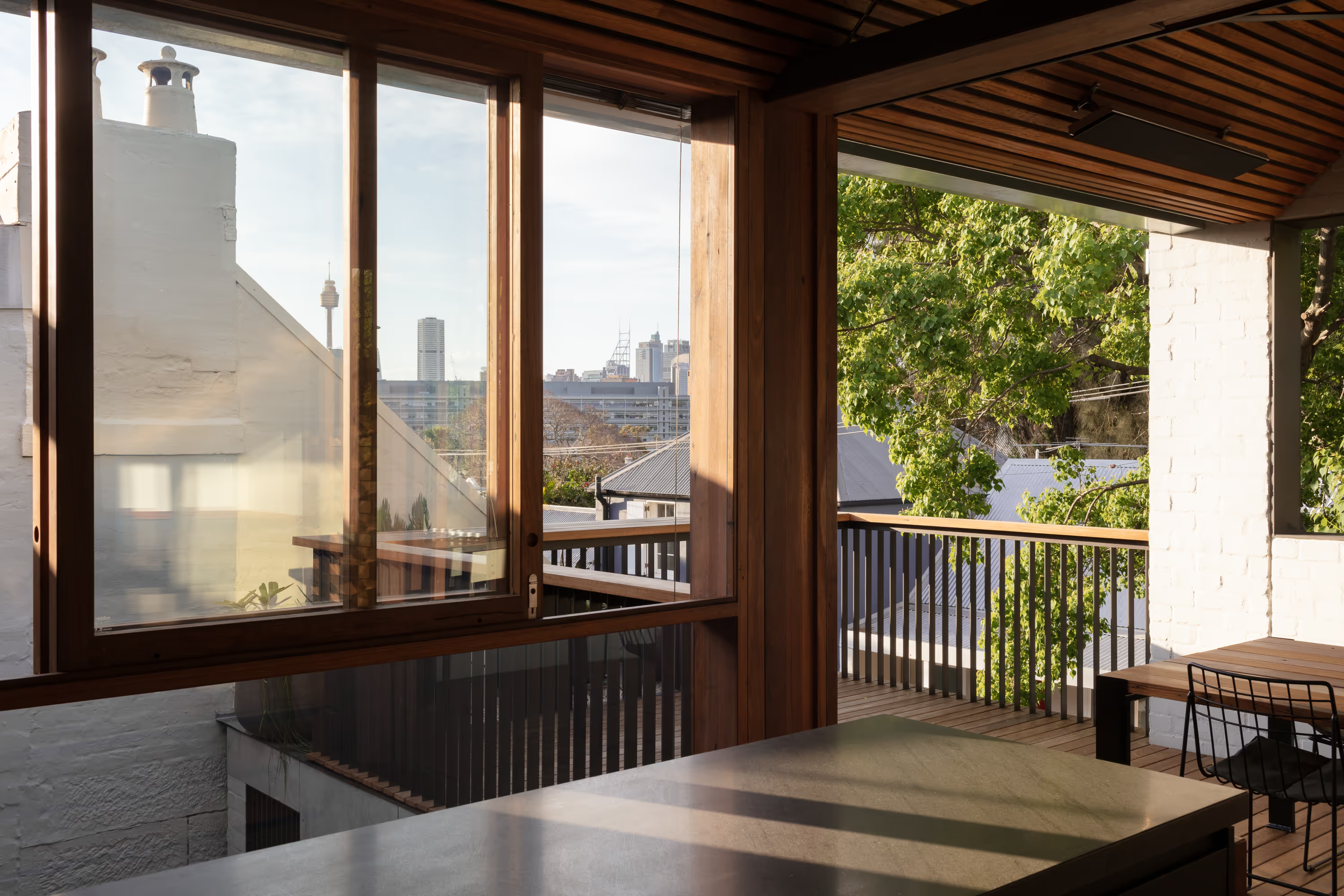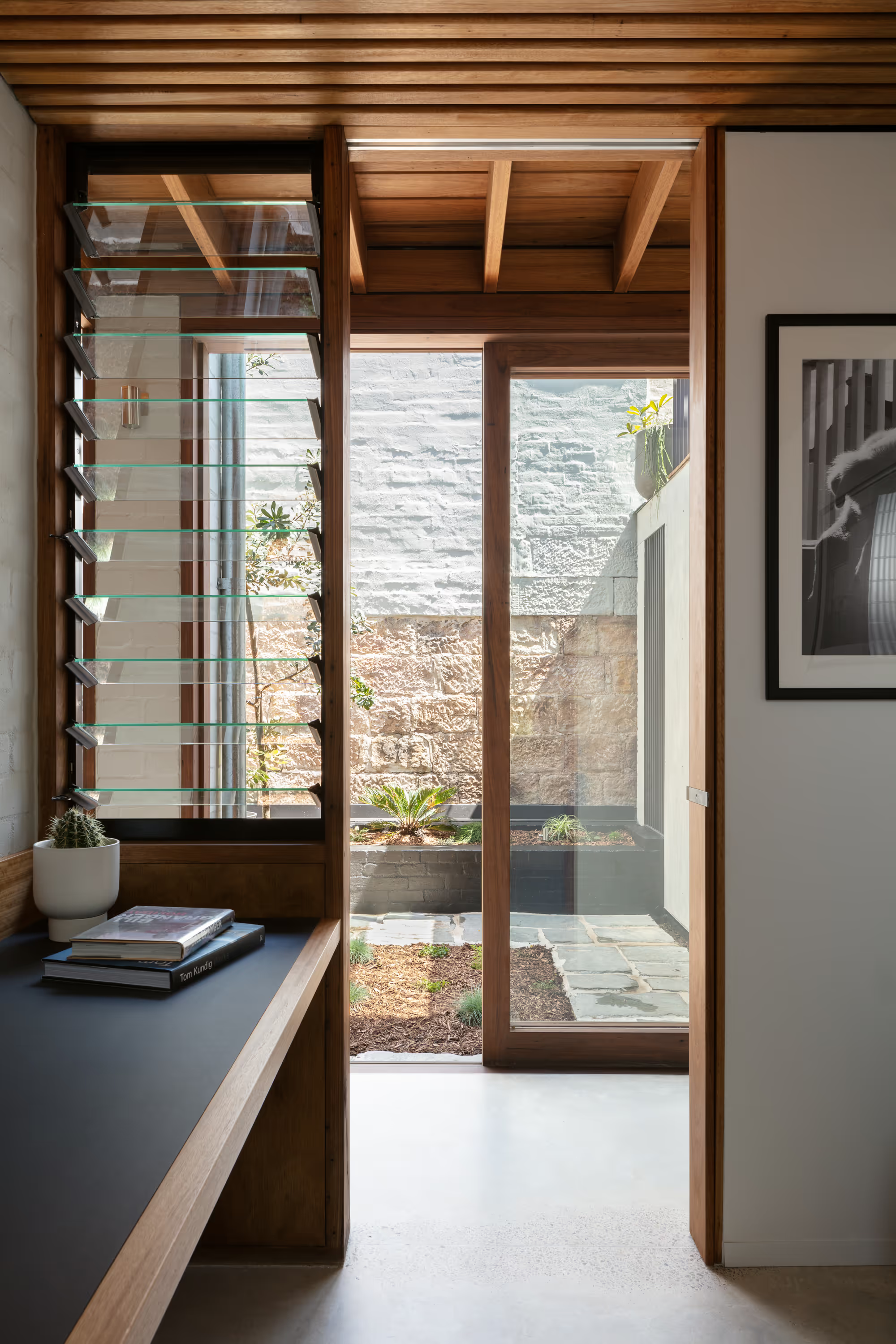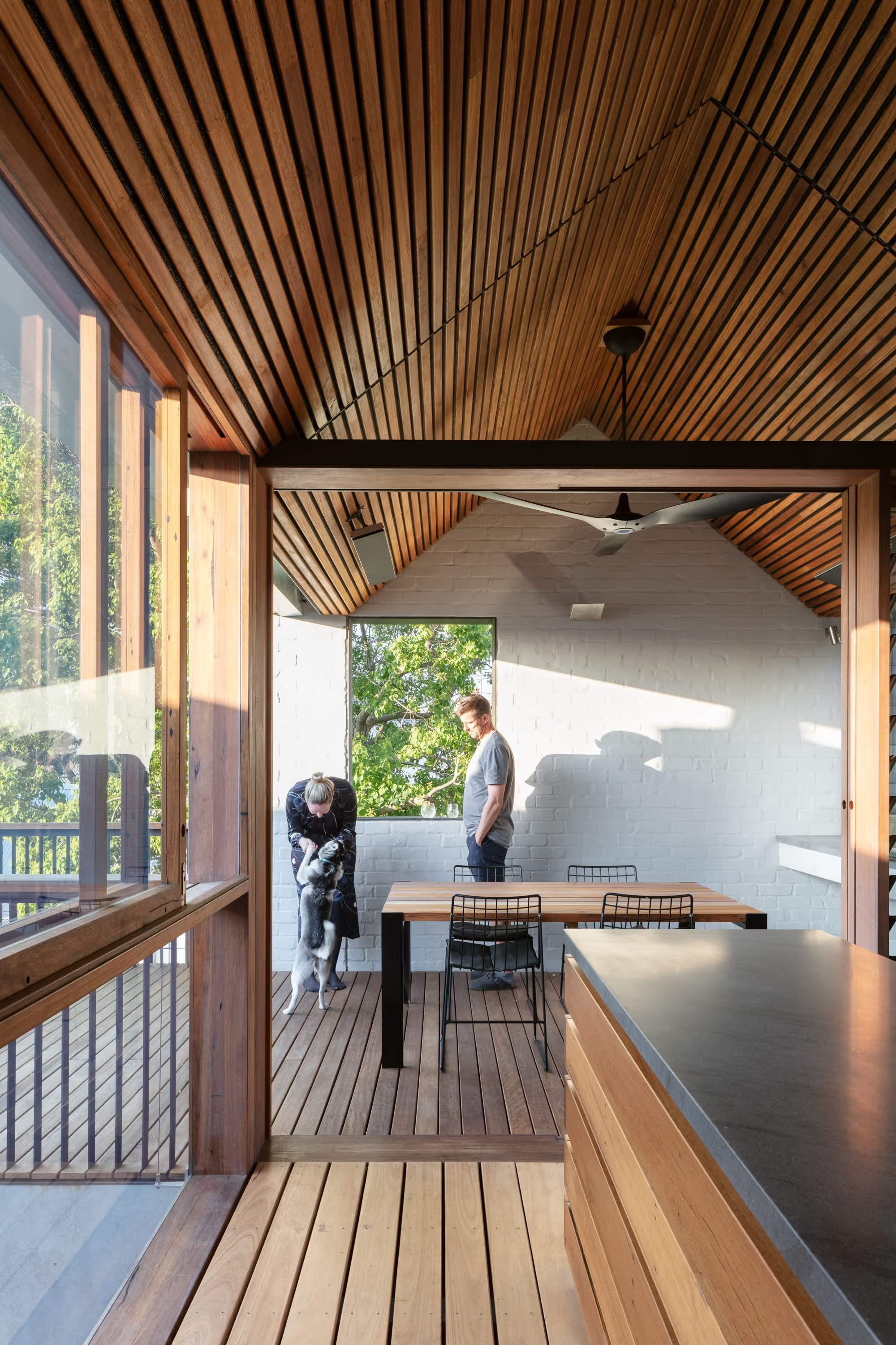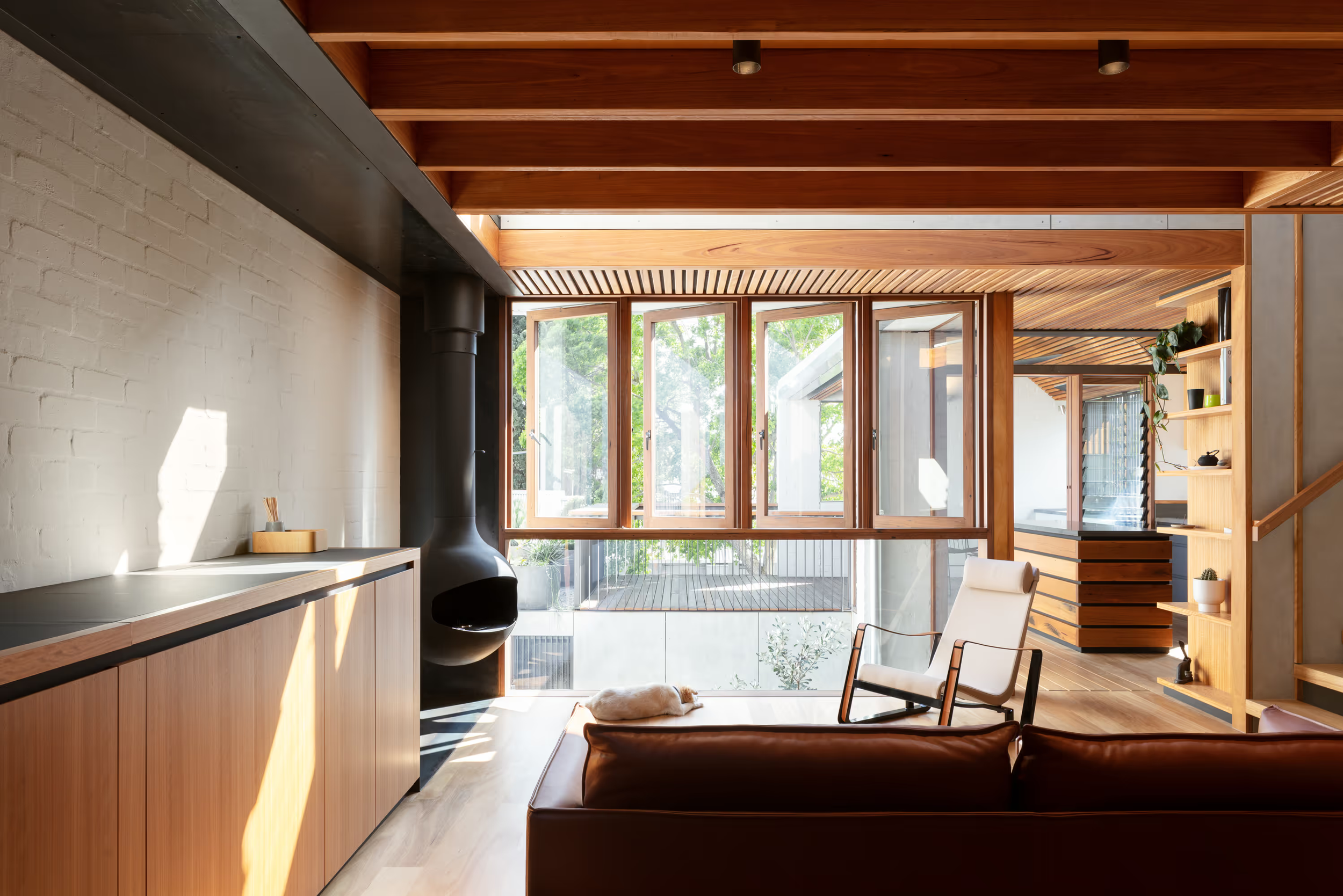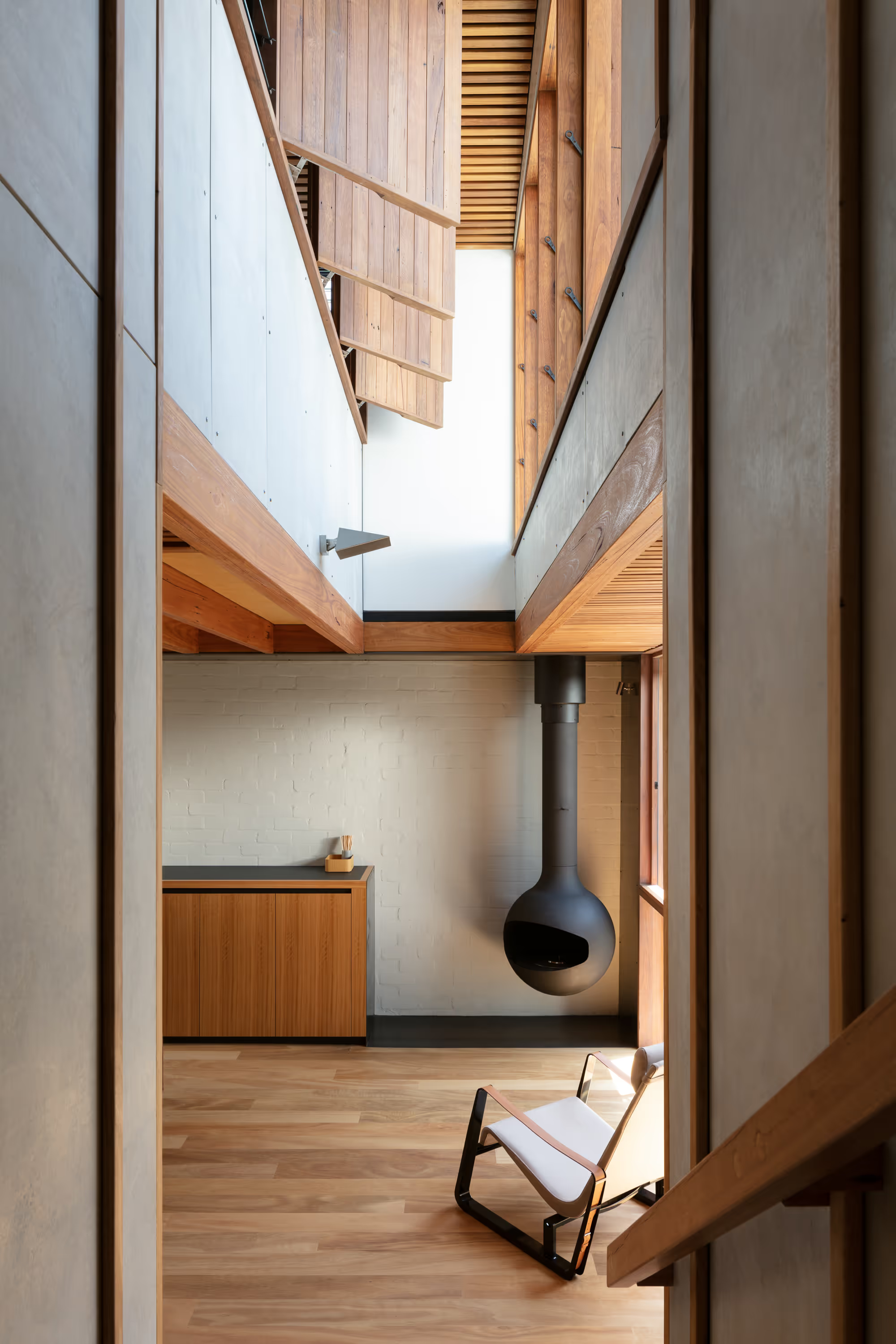The design prioritised sustainability by extensively using recycled and responsibly sourced materials. Reclaimed bricks and blackbutt timber featured prominently in floors, joinery, ceilings, and window frames. Additionally, salvaged hardwood from the site was repurposed into furniture pieces, exemplifying a commitment to material reuse.