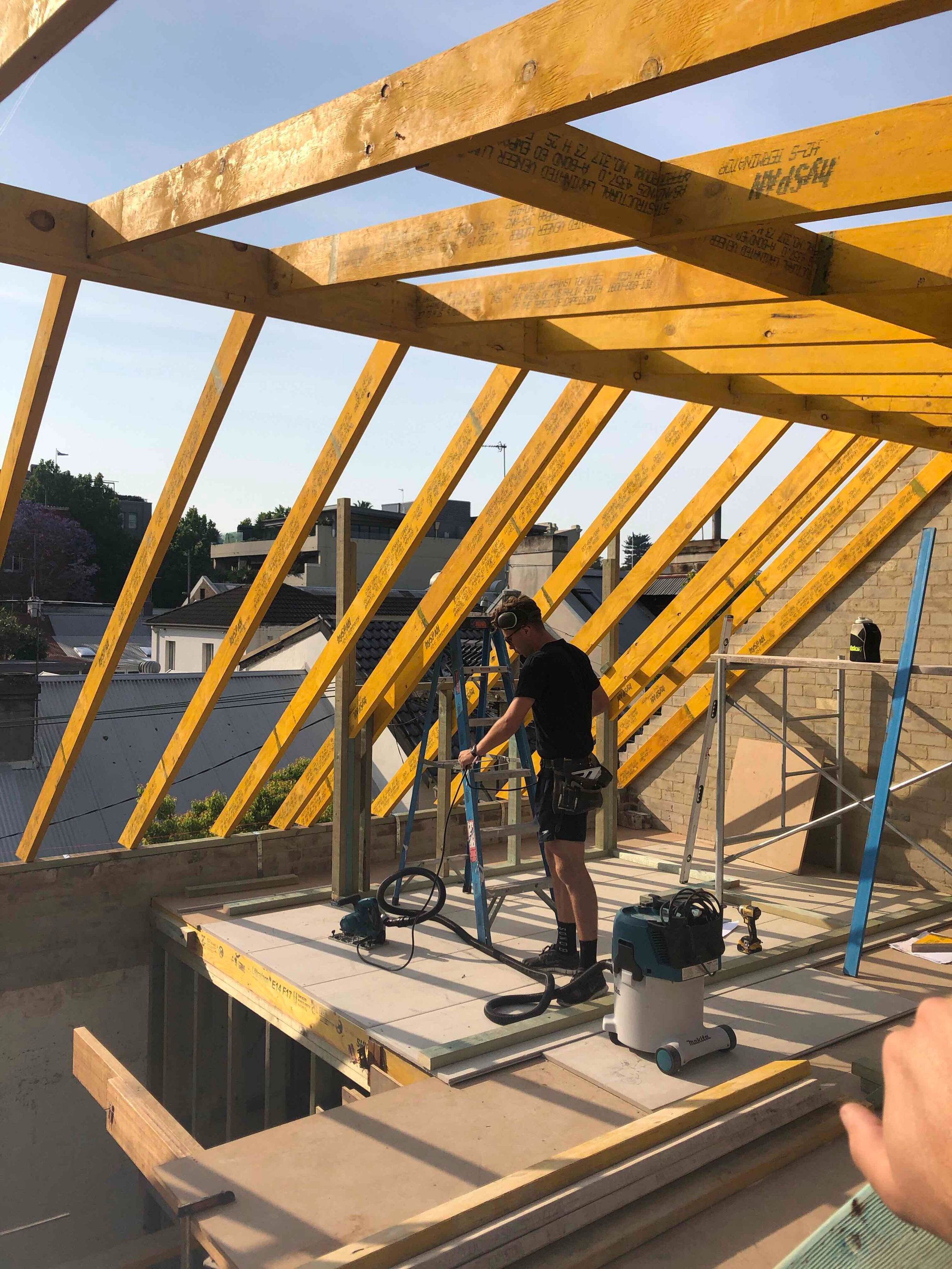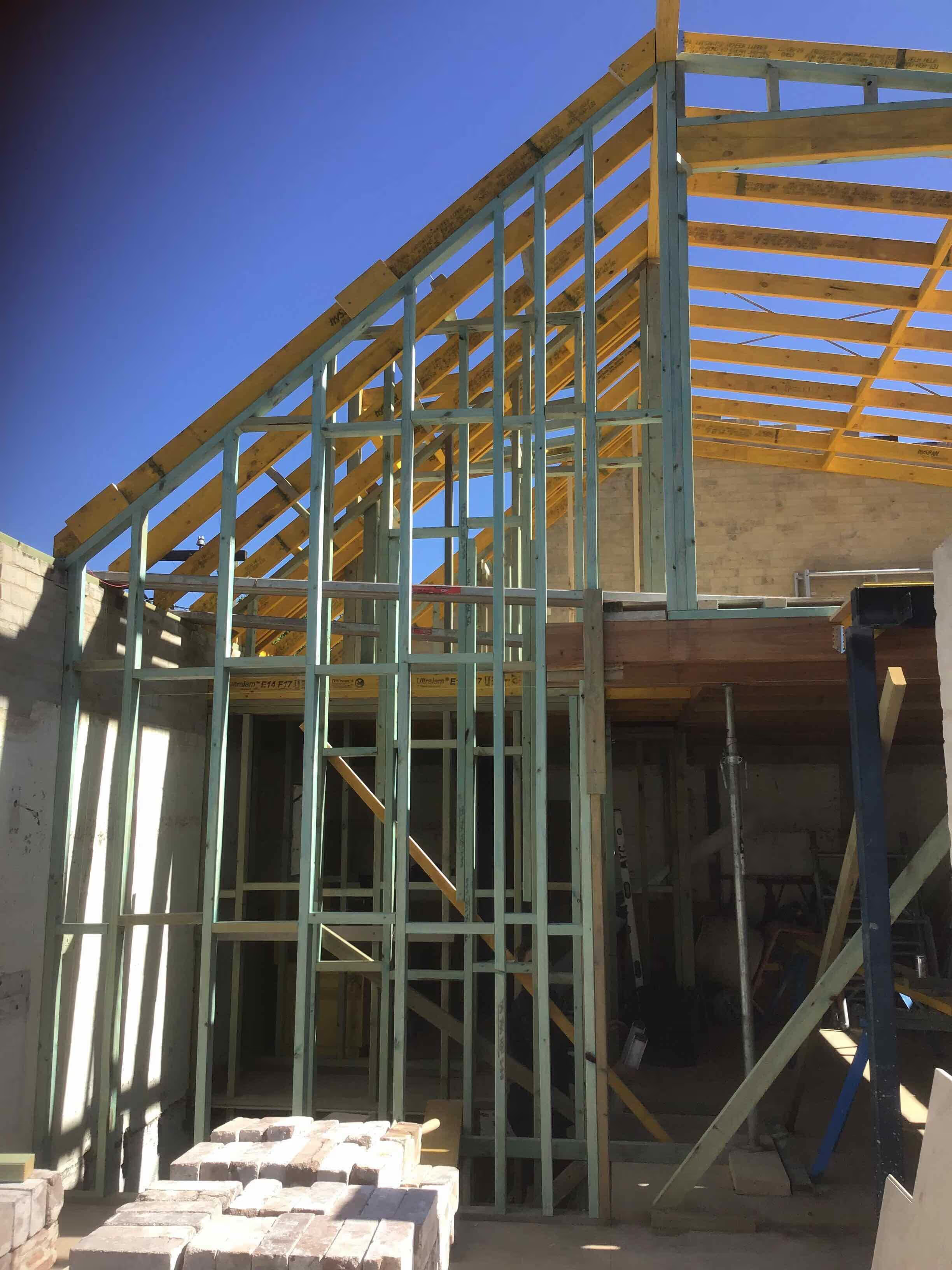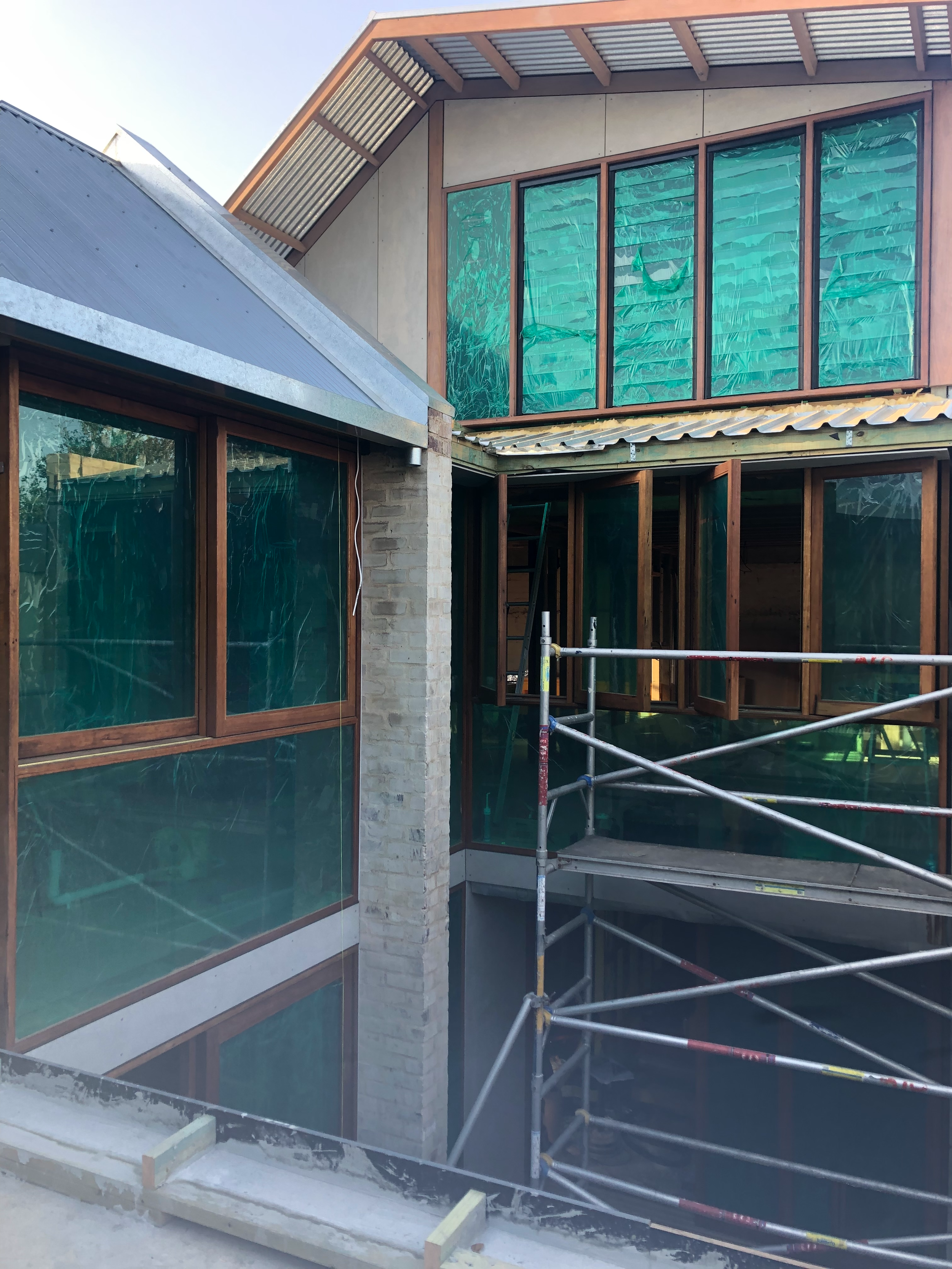 A complex double brick build supported internally by a timber structure with zero tolerance demands. Recycled blackbutt was used throughout, particularly where structure remained exposed and aligned with full-height openings. The perimeter walls and sections of the slab were retained, requiring careful integration between new and existing elements. Temporary propping was used to support the upper floor during framing, while recycled brickwork was reintroduced with precision across the new form.