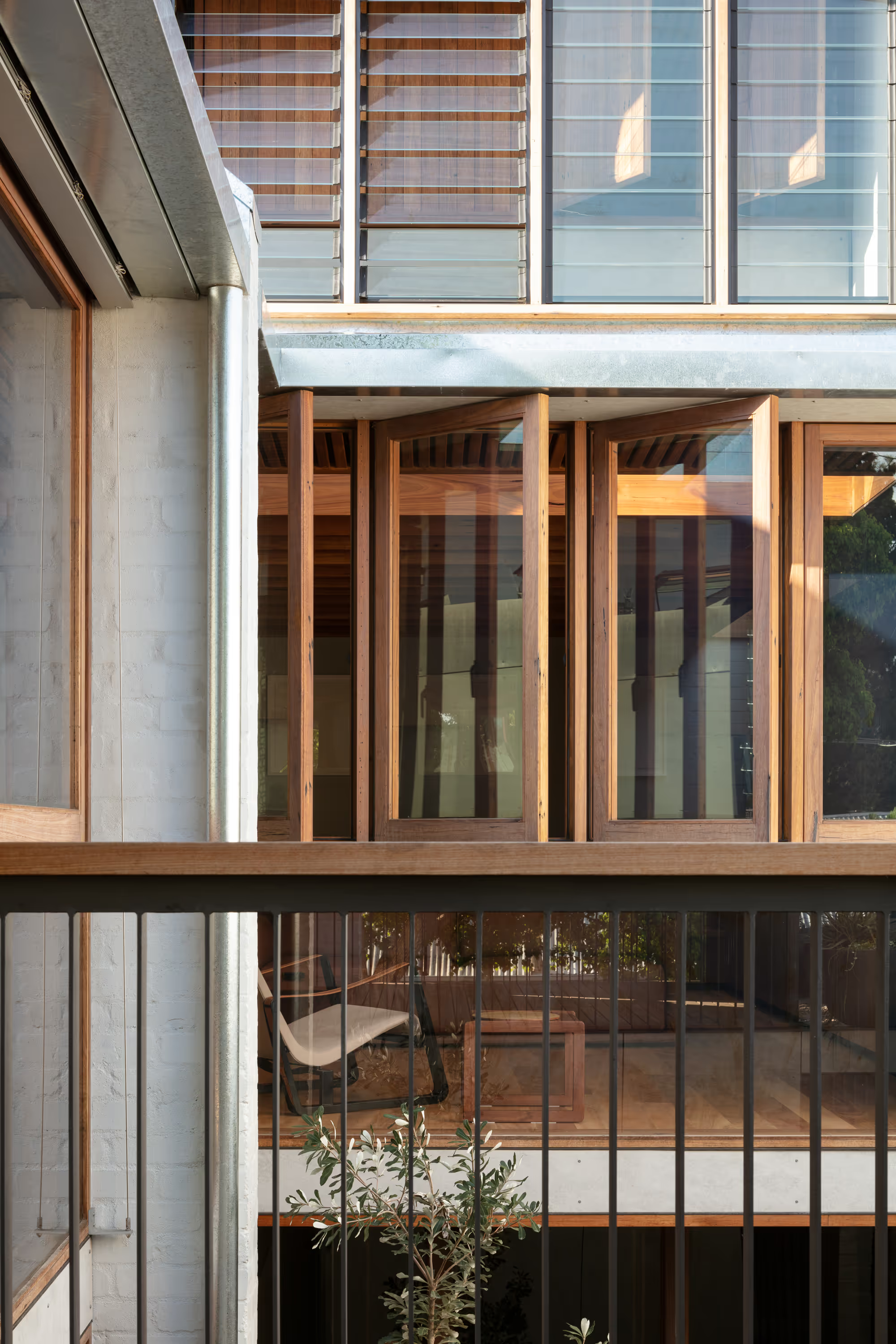 The home's layout centers around a private courtyard, facilitating natural light penetration and cross-ventilation across all three levels. Operable screens and internal shutters made from recycled blackbutt timber provide adjustable shading and privacy, enhancing thermal comfort without reliance on mechanical systems.